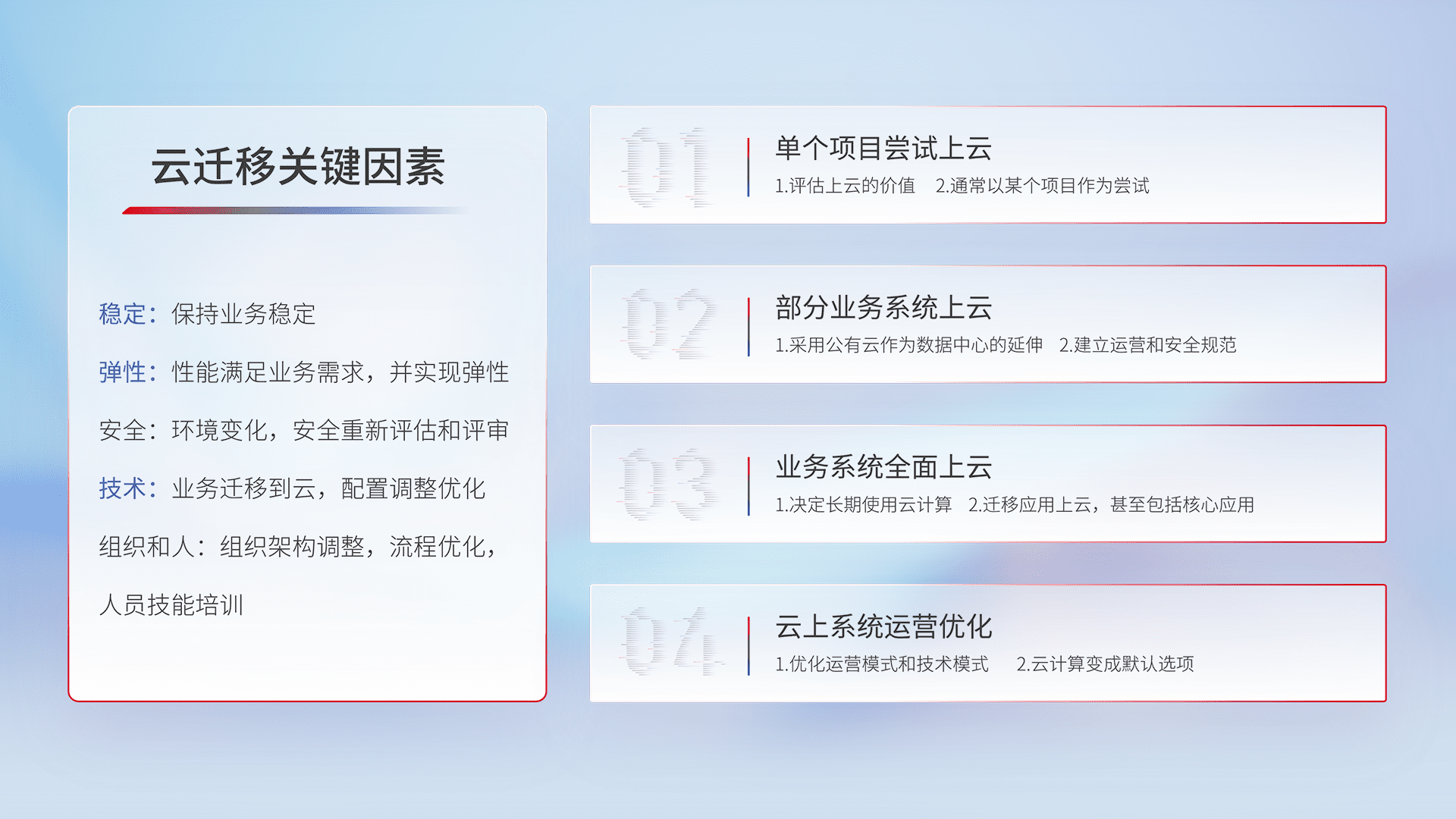 结合实际业务,,,从规划设计、、、、云平台选型、、、、云原生改造、、、数据迁移、、、集成交付,,,,迁移全过程为客户识别最佳上云路径,,,做好风险识别管理,,,,设计网络架构、、、、身份权限、、、安全审计合规、、操作审计、、、日志审计、、监控告警策略、、、多站点容灾设计等,,,,对云上基础设施进行整体规划,,,提升IT治理水平,,以满足弹性、、、高可用、、、高性能的需求。。