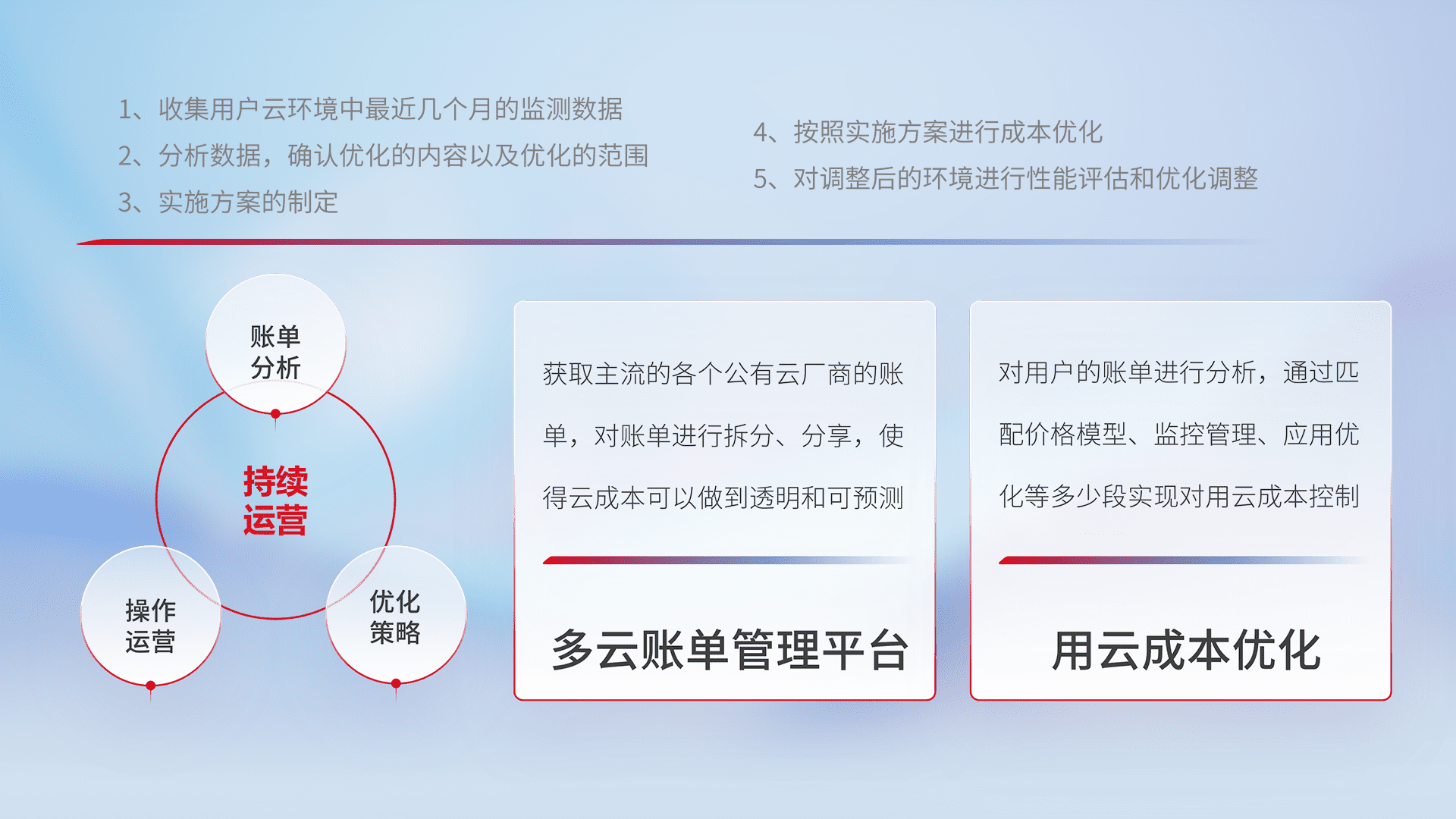 通过多云纳管,,以统一的资源数据模型把客户的云资源进行抽象和封装,,进而实现对多云资源的统一操作,,保障云资源管理的可靠性、、、稳定性与可用性。。。。量身定制化运维内容,,配置、、、开发运维、、、、补丁管理、、、备份、、、监控、、、、认证和访问管理、、、审计和日常巡检等,,,,保障在用云过程中的可靠度,,,稳定度以及高可用率。。。。